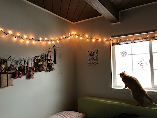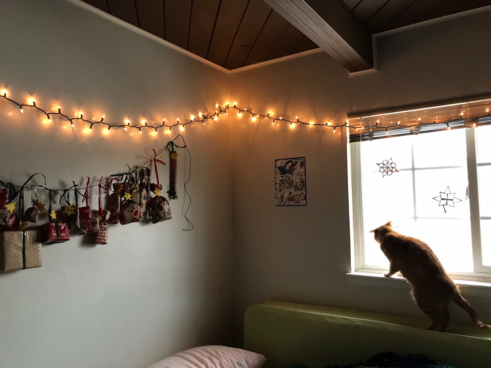 Meine WG hat sich auch schon weihnachtlich herausgeschmückt, ich habe meine Mitbewohner mit einem Adventskalender überrascht und meine Mama hat mir auch einen von zuhause geschickt. Leider konnte ich nur einen Adventskranz ohne Grünzeugs machen, weil Presley allergisch ist. Dafür hab ich dann halt Leland geschmückt.