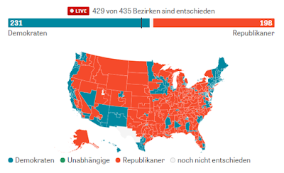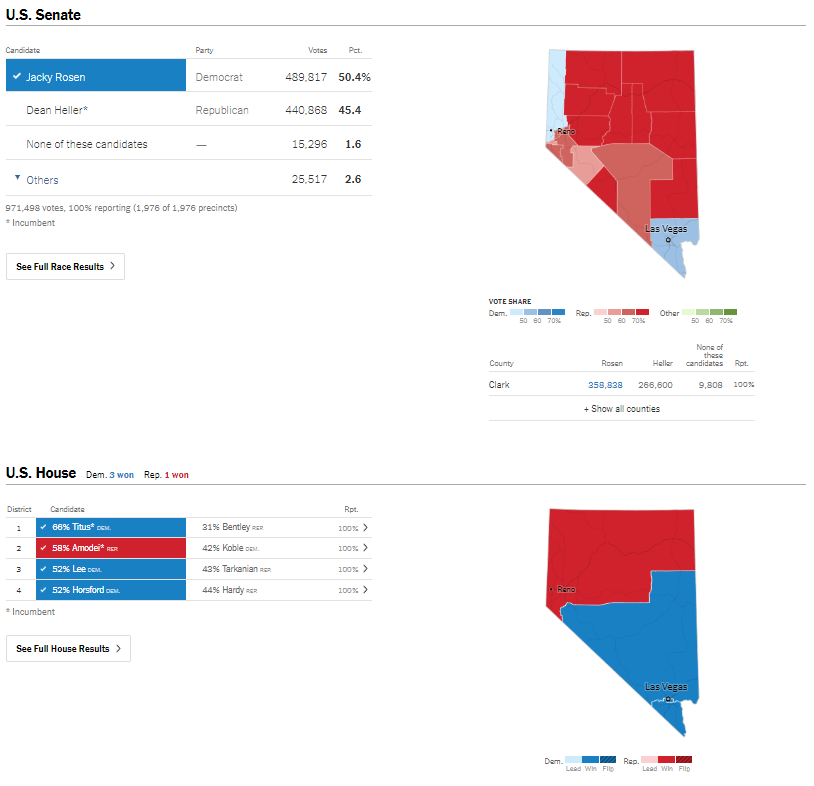 Der Congress besteht aus 2 Kammern, dem House of Representatives und dem Senat. Das House ist mit dem Bundestag vergleichbar, die Wahl ist auf 4 Jahre und hier hat sich die republikanische in eine demokratische Mehrheit verwandelt. Der Wahlkreis um Reno hat sich leider für den republikanischen Repräsentanten entschieden, während der Rest von Nevada blau geblieben ist.